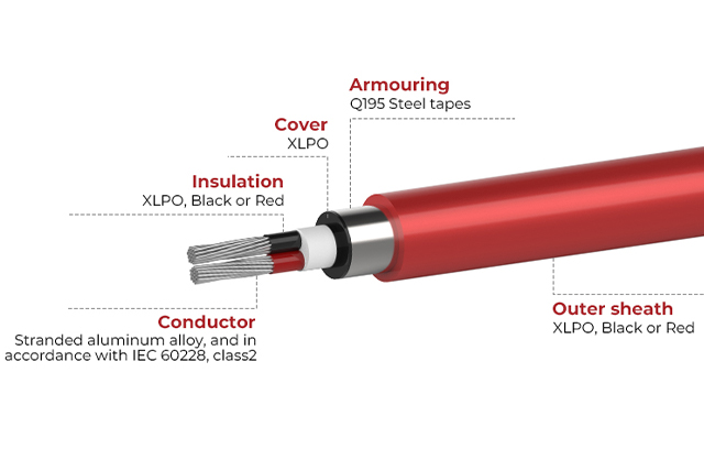 Câble blindé SUNKEAN TÜV 2PfG/2642 1 500 V CC à âme en aluminium Le fil d'enterrement direct est isolé et gainé d'un composé de polyéthylène réticulé (XLPO) et convient à une variété d'environnements extérieurs difficiles. Il appartient à la catégorie des câbles directement enterrés qui peuvent être armés pour se protéger contre les dommages mécaniques et les morsures de rongeurs, et en même temps peuvent être utilisés sans être gainés dans des conduits.