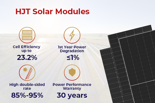 Haute efficacité : les panneaux solaires HJT ont un rendement de conversion de 26,07 % pour les modules monoraciaux et de plus de 30 % pour les modules bifaciaux, ce qui en fait l'une des technologies solaires les plus efficaces de l'industrie.