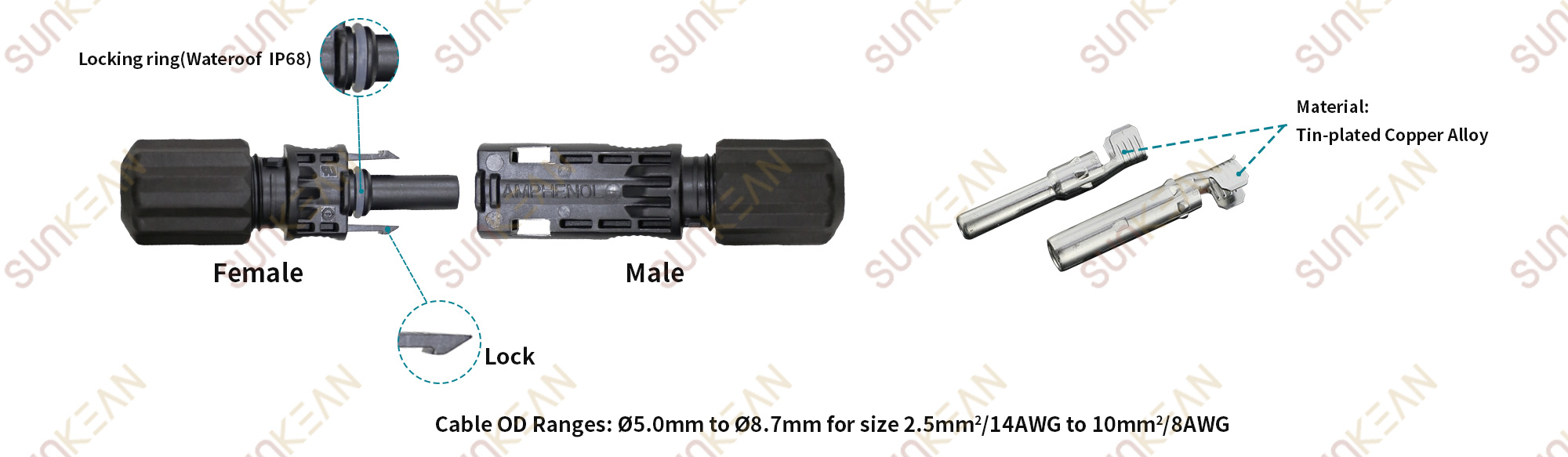 la connecteur h4 plus fourni par SUNKEAN est un connecteur DC robuste, à double certification avec UL 6703 1500V et IEC 62852 (ed.1); am 1 1500V (classe A) spécifications et certifications. en tant qu'évolution du connecteur H4, le connecteur H4 plus comprend une excellente durabilité, configuration d'accouplement compatible amphenol, technologie de contact RADSOK® à faible résistance d'amphenol, capacité à accepter des calibres de fil de 14awg/2.5mm² à 8awg/10mm², et un indice de protection IP68. les améliorations par rapport au H4 inclus dans les connecteurs H4 plus sont un contre-écrou à cliquet, qui empêche le retour une fois l'écrou est serré, un œillet d'étanchéité amélioré pour une meilleure performance de fuite humide, et une conception de contact optimisée pour une excellente stabilité à long terme. en utilisant des écrous de presse-étoupe, des joints environnementaux, des pinces de retenue de fil, et des contacts qui acceptent plusieurs calibres de fil, le nombre de pièces est réduit et de réelles économies sont générées.