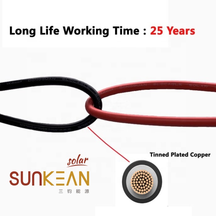Les câbles photovoltaïques sont constamment exposés à la lumière du soleil et les systèmes solaires fonctionnent souvent dans des conditions environnementales difficiles telles que des températures élevées et des rayons UV. Les jours ensoleillés, la température du site du système solaire peut atteindre 90-100℃. Le câble solaire SUNKEAN est certifié par TUV/CE/UL, spécialisé dans le travail pour le système solaire. Si vous choisissez des câbles en PVC ordinaires au lieu de câbles photovoltaïques, cela affectera évidemment considérablement la durée de vie du système solaire.