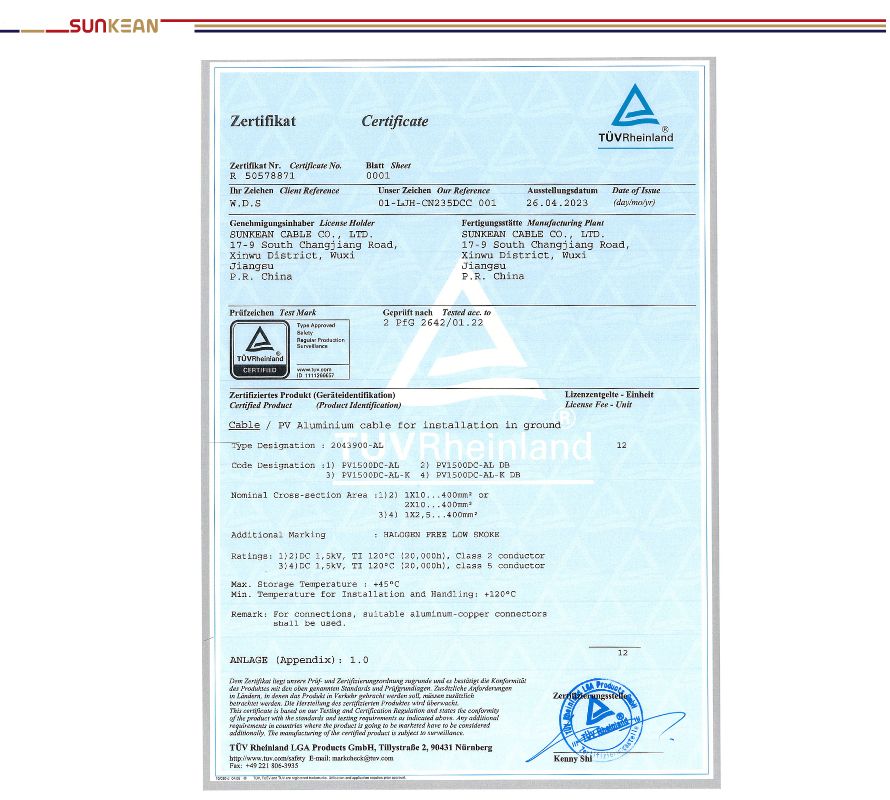 Nous sommes ravis d'annoncer que le fil photovoltaïque en aluminium de SUNKEAN a récemment franchi une étape importante en obtenant la certification TÜV : 2 PfG 2642. Cette certification valide davantage la haute qualité et la fiabilité de notre produit, offrant à nos clients une solution solaire améliorée.