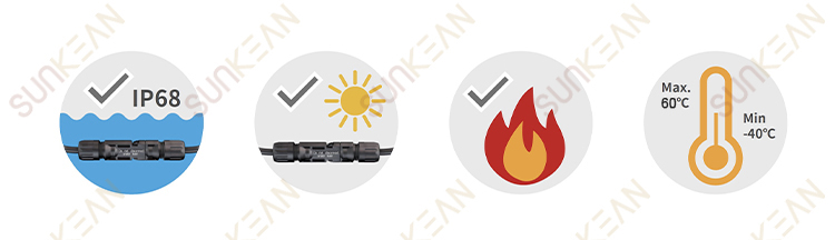 L'ensemble de fusibles en ligne SUNKEAN est composé de matériaux de haute qualité résistants aux intempéries et d'un processus de fabrication scellé par moule pour assurer une fiabilité à long terme. Ils peuvent être installés sur place. Une faible résistance de contact et une capacité de transfert de courant élevée garantissent une efficacité de production élevée. Avec un indice d'étanchéité IP68, il peut être utilisé dans une large plage de températures de fonctionnement.