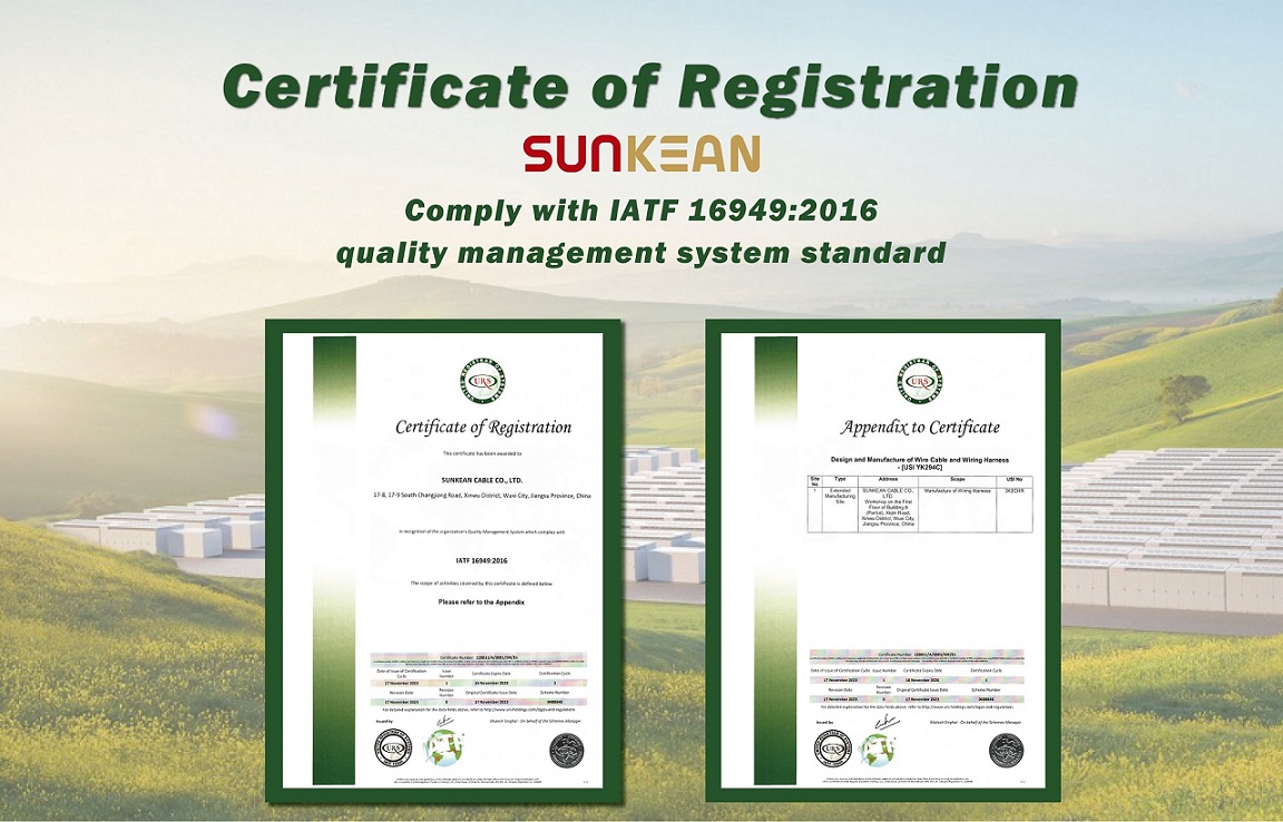 La certification IATF16949 est une norme de système de gestion de la qualité développée par l'International Automotive Task Force (IATF) et représente la norme de qualité la plus élevée de l'industrie automobile mondiale. Peu de temps après avoir remporté la première nouvelle version au monde du certificat de câble de stockage d'énergie TUV Rheinland, SUNKEAN a remporté la certification IATF16949 et a manqué le " ;Vitesse SUNKEAN" encore une fois.
