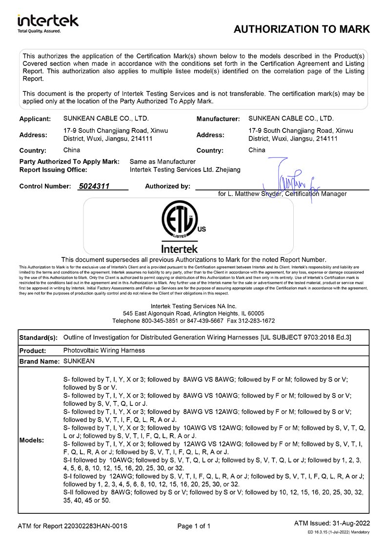Récemment, les produits de harnais de câblage photovoltaïque de SUNKEAN ont passé avec succès le test du groupe Intertek Intertek et ont terminé le processus de certification, et ont reçu le certificat Intertek ETL. L'acquisition du certificat ETL fournira un certificat de qualité de produit tiers crédible pour les produits SUNKEAN Photovoltaic Wiring Harness pour entrer sur le marché nord-américain, ce qui permettra aux acheteurs d'accepter plus facilement les données de qualité des produits.