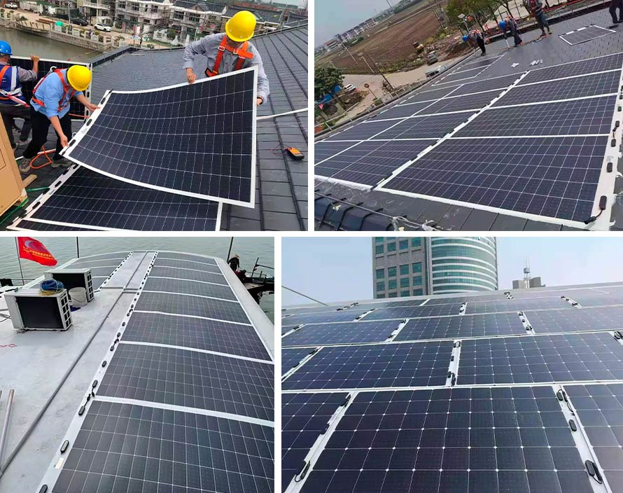 Le panneau solaire flexible de 375 W adopte un design léger et fin. Des plaquettes de silicium ultra-minces avec des matériaux d'encapsulation polymères organiques avancés, un rayon de courbure minimum atteignant 0,30 mm, s'adaptent parfaitement à tous les types de surfaces incurvées.