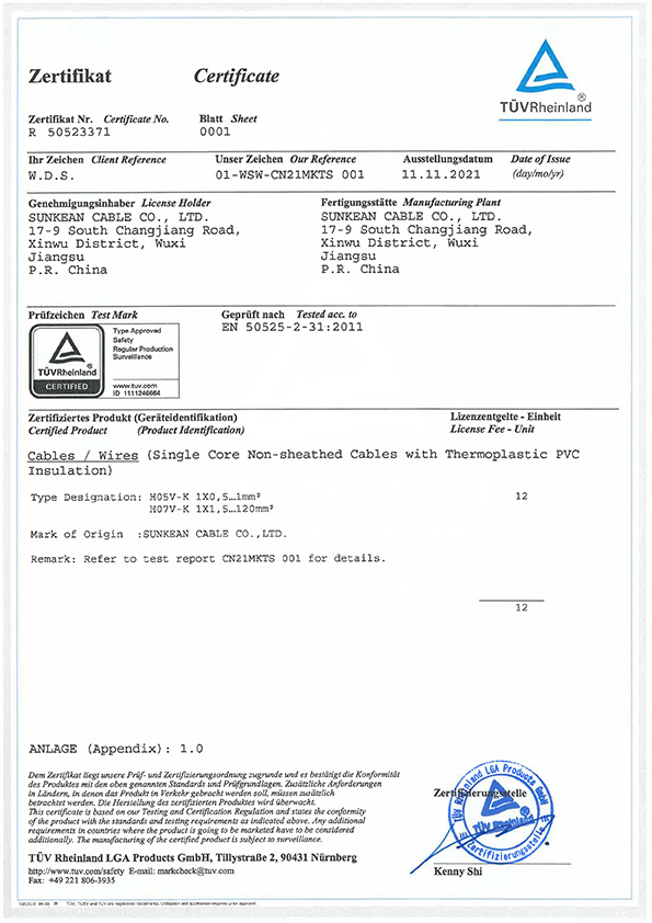 Certificat H05V-K/H07V-K