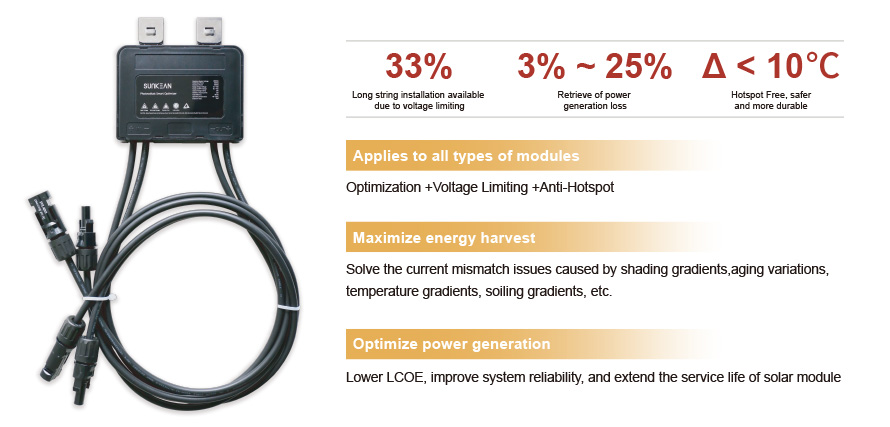 Les optimiseurs externes de module PV de sunkean peuvent être fixés à l'arrière de chaque panneau solaire du réseau., ils optimisent les performances de chaque panneau du système solaire, quelle que soit l'orientation du soleil, l'ombre, ou voire endommager un ou plusieurs panneaux.