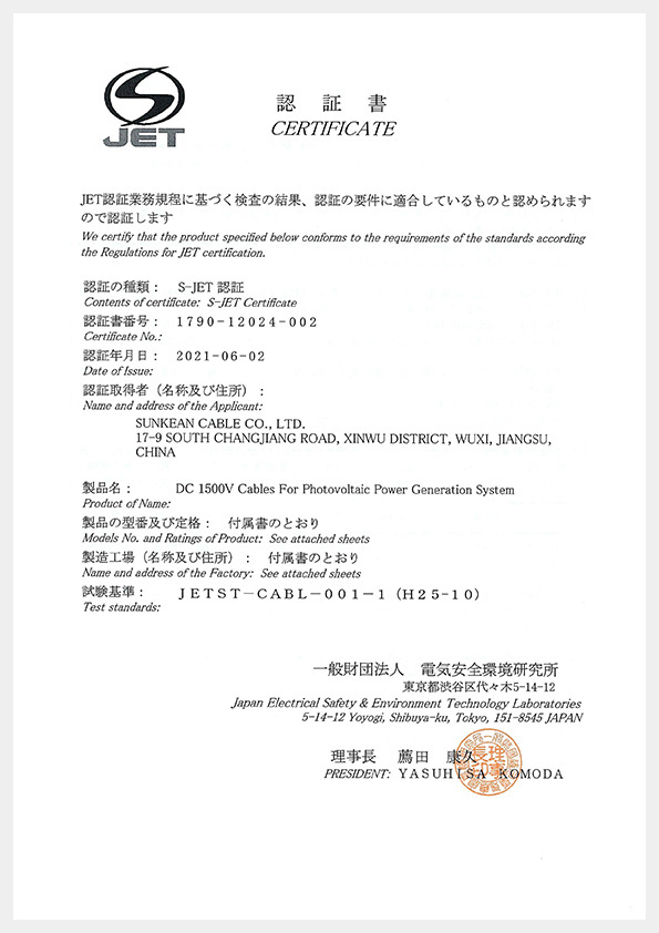 Certificat de câble solaire S-JET PV-CQ