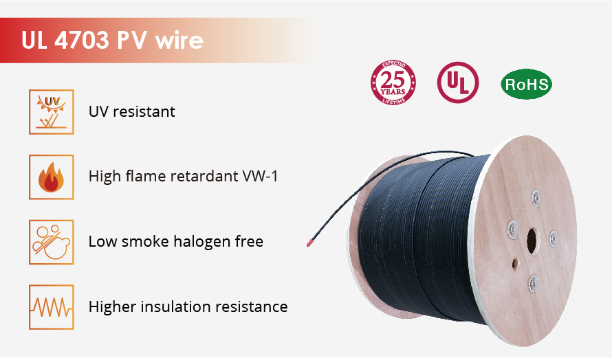 L'UL 4703 comporte des conducteurs en cuivre nu et une isolation XLPO double couche, il est destiné aux applications jusqu'à 2000 volts et à des températures de -40°C à +90°C humide ou sec.