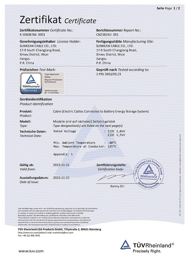 Nous sommes ravis d'annoncer que le fil de stockage d'énergie de SUNKEAN a obtenu une toute nouvelle certification TÜV : 2 PfG 2693/03.23 , qui est plus optimisée que la version proclamée en 2019.